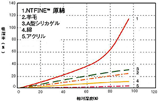 「NTFINE™」は、ウールの3倍、綿の5倍以上の高い吸湿性能を示す特殊なアクリレート系繊維です(グラフ参照)。また、周辺の湿度が高い条件では吸湿を、湿度が低い条件では放湿を、繰り返し行うことができます。