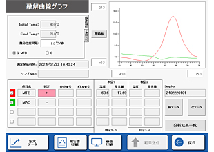 測定結果は定性情報と共に、波形グラフで目視で確認することができます。1検体ごとに内部標準(IC)を測定していますので、増幅不良の検出が可能です。