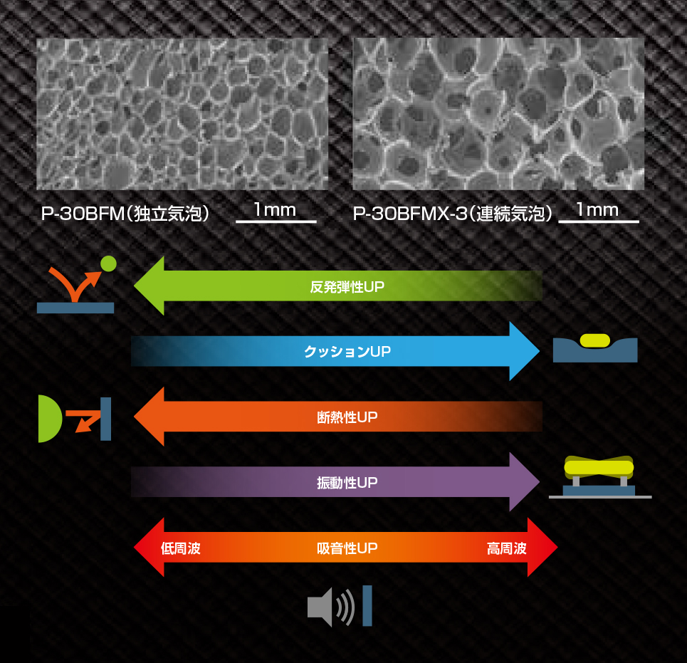 吸音特性:発泡構造を制御することで、幅広い周波数帯域の吸音が可能