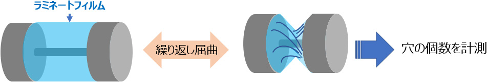 フィルムを屈曲した時の穴の開きにくさを評価するため、「ハーデン®DN036」を用いたラミネートフィルムと従来品(N2100)を使用したラミネートフィルムのゲルボフレックス試験の結果を下図に示しました。