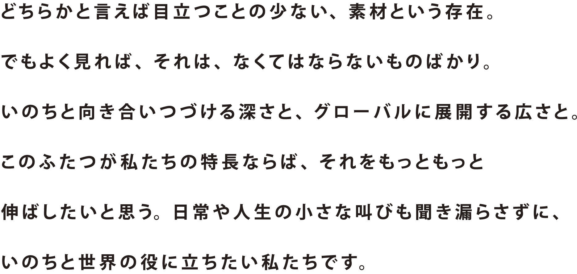 - お客様との共創、およびパートナーとの協業を通じて、多様な素材を目的性能に最適化することで、顧客価値を創造し、人々の暮らしと地球環境を「ゆたか」にする。そして、私たち(人・企業)も成長・発展し続ける