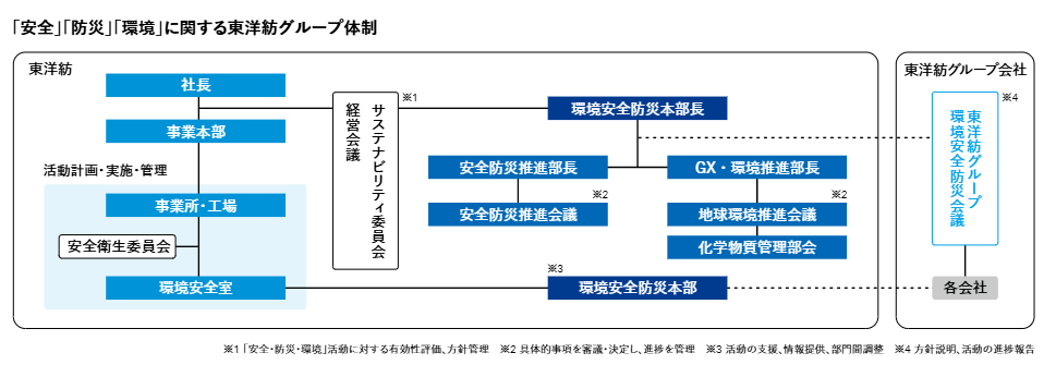 環境安全防災本部長(代表取締役 兼 専務執行役員)は、東洋紡グループの安全防災の基本方針、年度毎の重点活動を立案・策定し、サステナビリティ委員会で報告、決定します。進捗については経営会議で適宜、報告します。また、各拠点や部門代表をメンバーとする東洋紡グループ環境安全防災会議を主催し、決定された方針や活動内容を共有するとともに、各部門での安全・防災活動の有効性を評価しています。